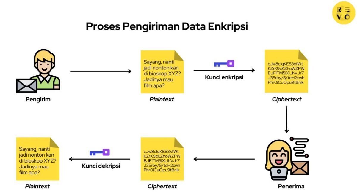 - Data terenkripsi dikirim atau disimpan: Data yang sudah diubah menjadi bentuk acak dan tidak bermakna ini kemudian dikirim melalui jaringan atau disimpan di tempat penyimpanan.